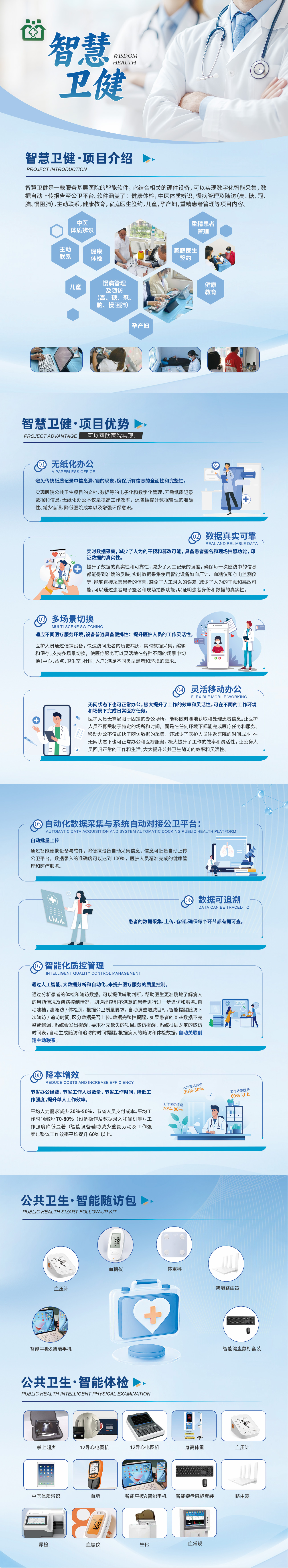 公司智慧卫健解决方案,整合智能便携式检测设备+智能软件+平台,实现所有检测数据自动对接公共卫生系统,全面覆盖公共卫生服务、慢病随访、健康体检、居民健康档案管理等应用场景。并且,通过移动终端、智能设备,可随时随地为辖区居民完成家庭医生签约服务。